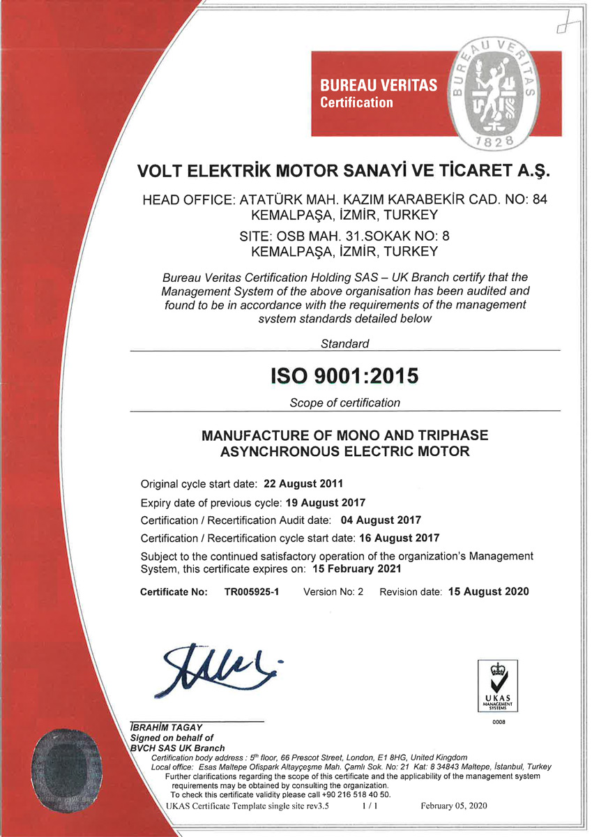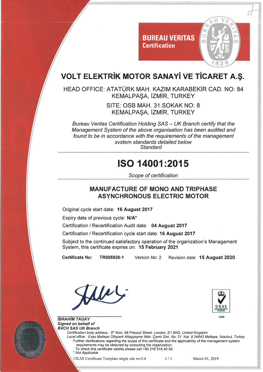 | ISO 14001:2015 DESIGN, MANUCFACTURE AND SALES OF MONO AND TRIHASE ASYNCHRONOUS MOTOR |